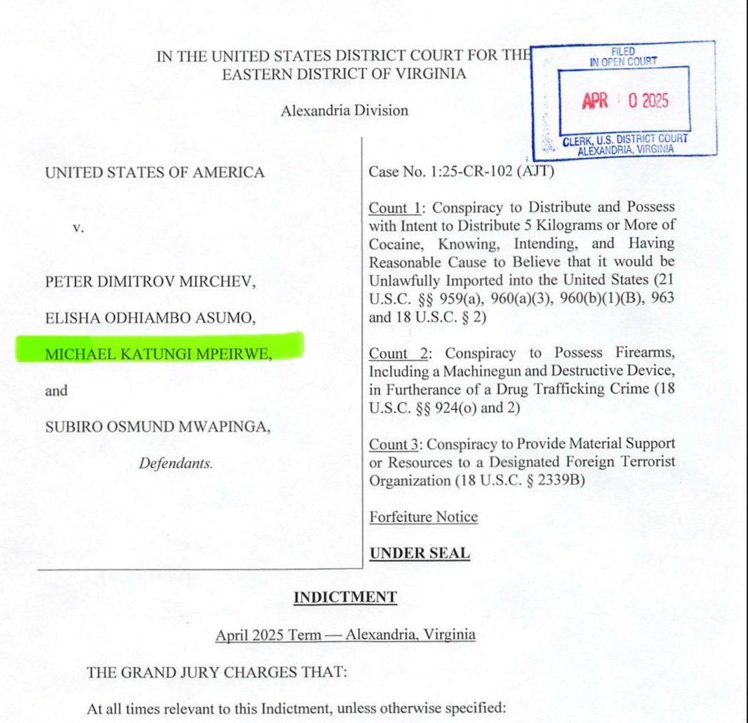 Michael Katungi Mpeirwe, Elisha Odhiambo Asumo, Subiro Osmand Mwapinga (Kenyan nationals) and Peter Dimitrov Mirchev were indicted on April, 2025 at the District Court, Alexandria Virginia.