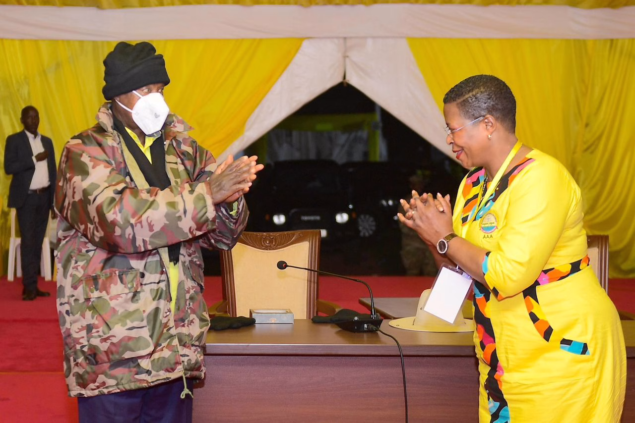 President Yoweri Museveni standing between the Rt.Hon. Speaker Annet Anita Among after winning the NRM first national vice chairperson(female) slot. Photo by Eric Dominic Bukenya.