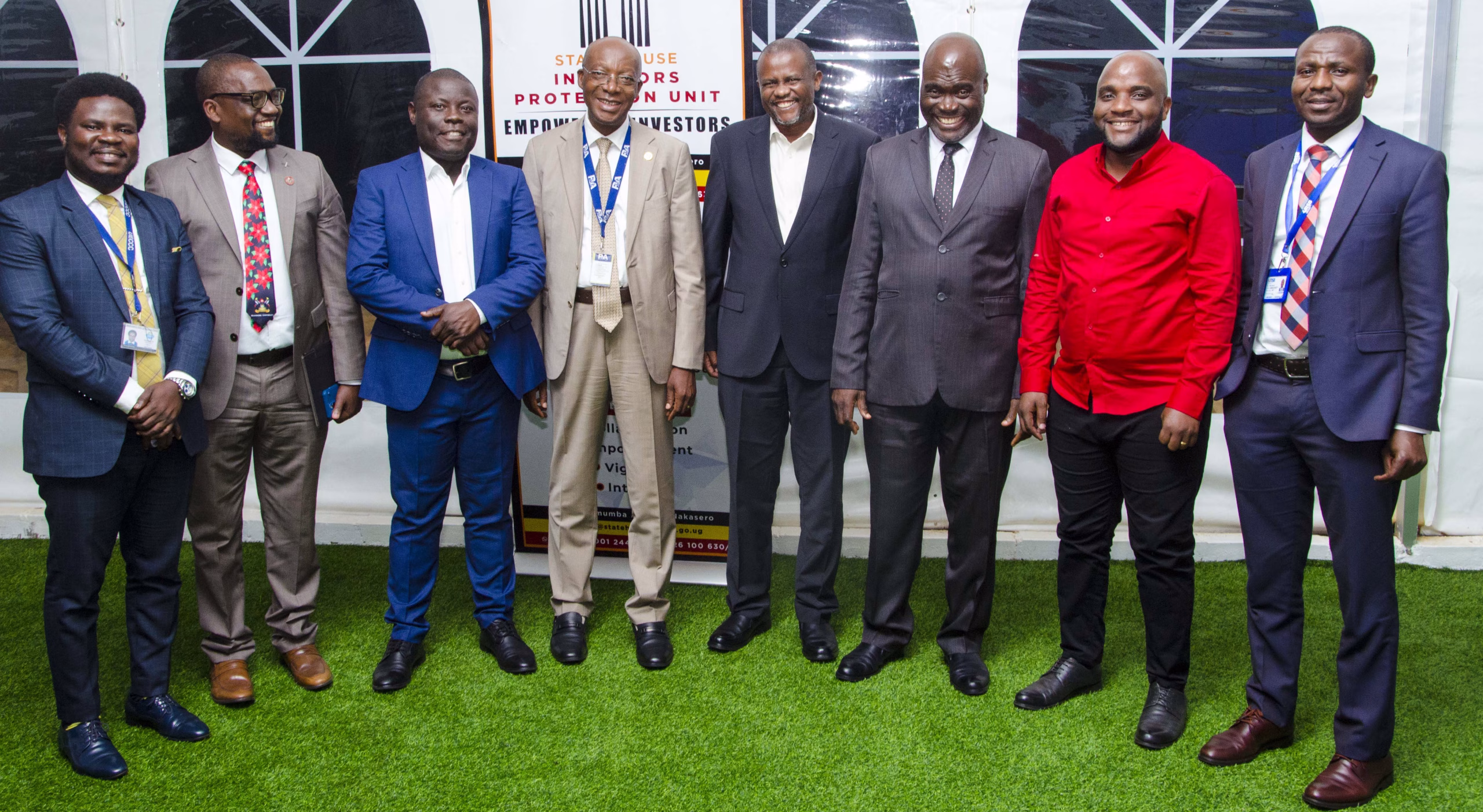 (L-R) Desmond Tutu Opio, Senior Monitoring & Evaluation specialist Uganda Energy Credit Capitalisation Company (UECCC), Prof. Bruce Kirenga, Makerere University, Edward Katende, Executive Director Uganda Development Forum, Benson Turamye, Executive Director of Public Procurement and Disposal of Public Assets Authority (PPDA), Patrick Birungi, Executive Director Uganda Development Corporation (UDC), Paul Mwesigwa, Managing Director Uganda Electricity Distribution Company Limited (UEDCL), Osborn Turyasingura, Secretary National Secretariat for Special Interest Groups and Walid Kule, Assistant Commissioner Uganda Registration Services Bureau (URSB) take a group picture after the meeting held at State House Investors Protection Unit Offices on Tuesday 16 September 2025. PPU PHOTO.