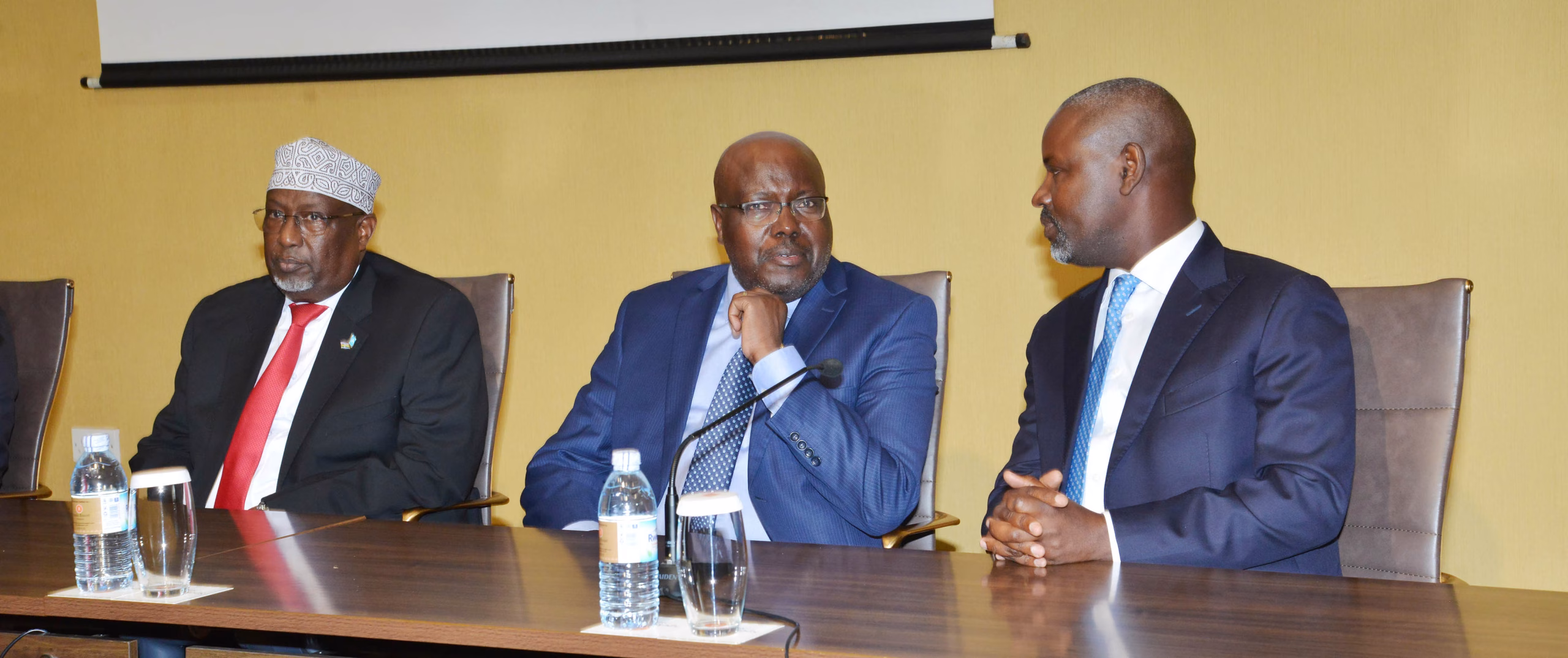 The Rt. Hon. Joseph Ntakirutimana, Speaker of the East African Legislative Assembly (EALA) with  the Speaker of the Senate of Kenya, Rt. Hon. Jeffah Amason Kingi  at Speke Resort Munyonyo 14th November,2025. Second right is the Speaker  of  Somalia’s Parliament Speaker, Sheikh Adan Mohamed Nur ‘Madoobe who  was elected Chair of the Bureau for the 2025–2026 term.Photo by Ronald Kabuubi/KMA Updates.