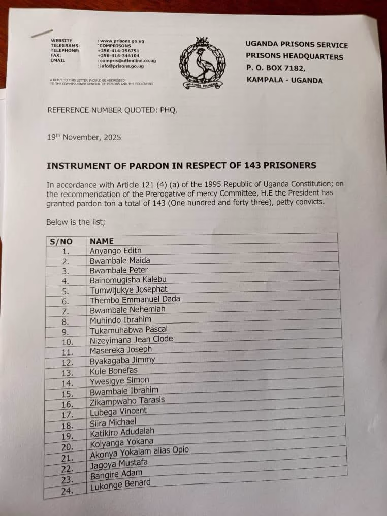The decision, made under Article 121(4)(a) of the Constitution, was relayed in an official instrument signed by the Attorney General and addressed to the Commissioner General of Prisons. The Uganda Prisons Headquarters acknowledged receipt of the communication on 14th November 2025, confirming the commencement of the release process.